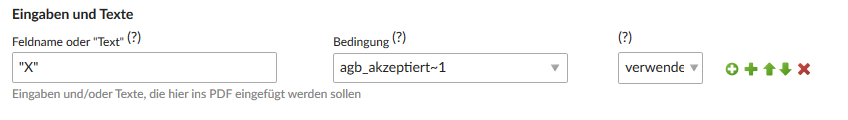 In der 2. Spalte kann für die Ausgabe eine Bedingung programmiert werden. Wenn die Bedingung leer ist, wird die Position immer ausgegeben. Im Beispiel ist das Komma abhängig davon, ob das Feld vorname im Formular ausgefüllt (verwendet) wurde. Das Komma wird also nur ausgegeben, wenn der vorname ausgefüllt wurde.